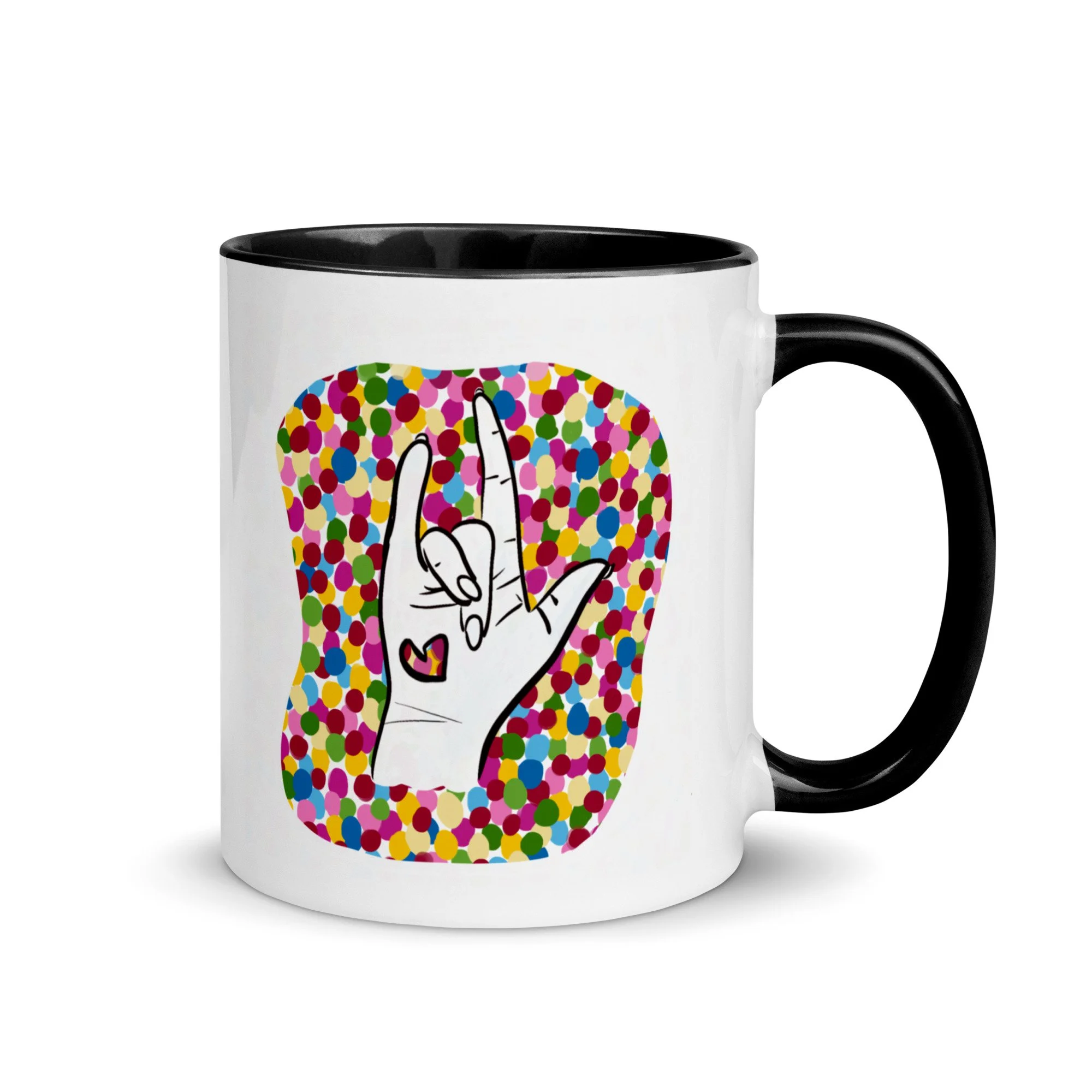 Rachel’s ASL I Love You Hand is the basis for a lot of our designs, including this colorful mug.